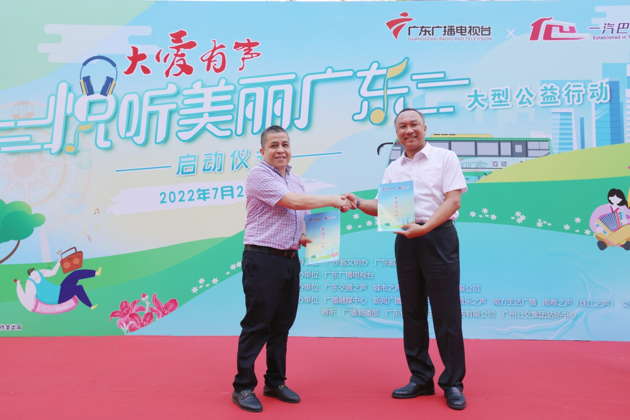 7月22日,“大愛(ài)有聲·悅聽(tīng)美麗廣東”大型公益行動(dòng)在廣州珠江新城公交總站正式啟動(dòng)。廣東廣播電視臺聯(lián)合廣州一汽巴士有限公司打造三輛“大愛(ài)有聲·悅聽(tīng)美麗廣東”主題公交,主題公交將穿梭在羊城街頭,變身“移動(dòng)融媒直播室”,用好聽(tīng)、好看、好玩的方式“講述”生態(tài)環(huán)境建設的生動(dòng)故事。