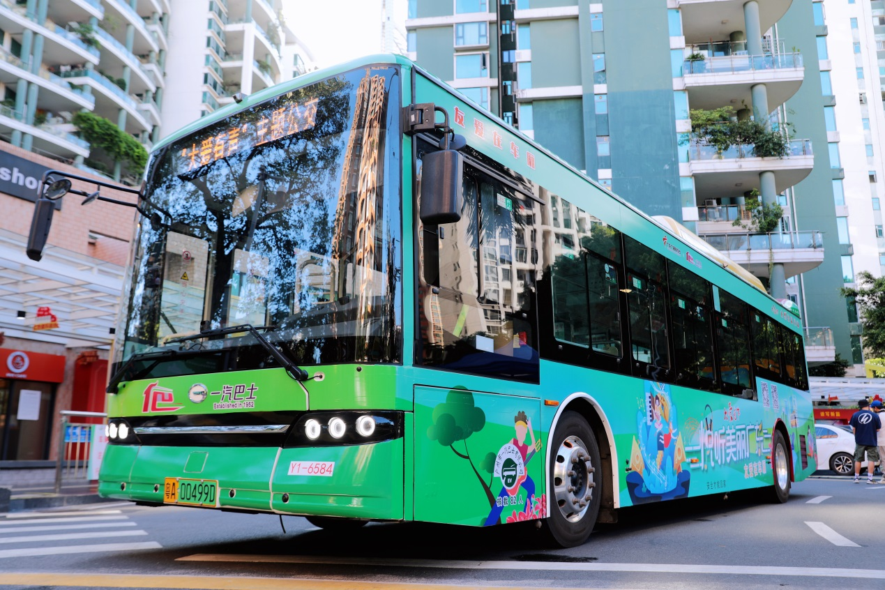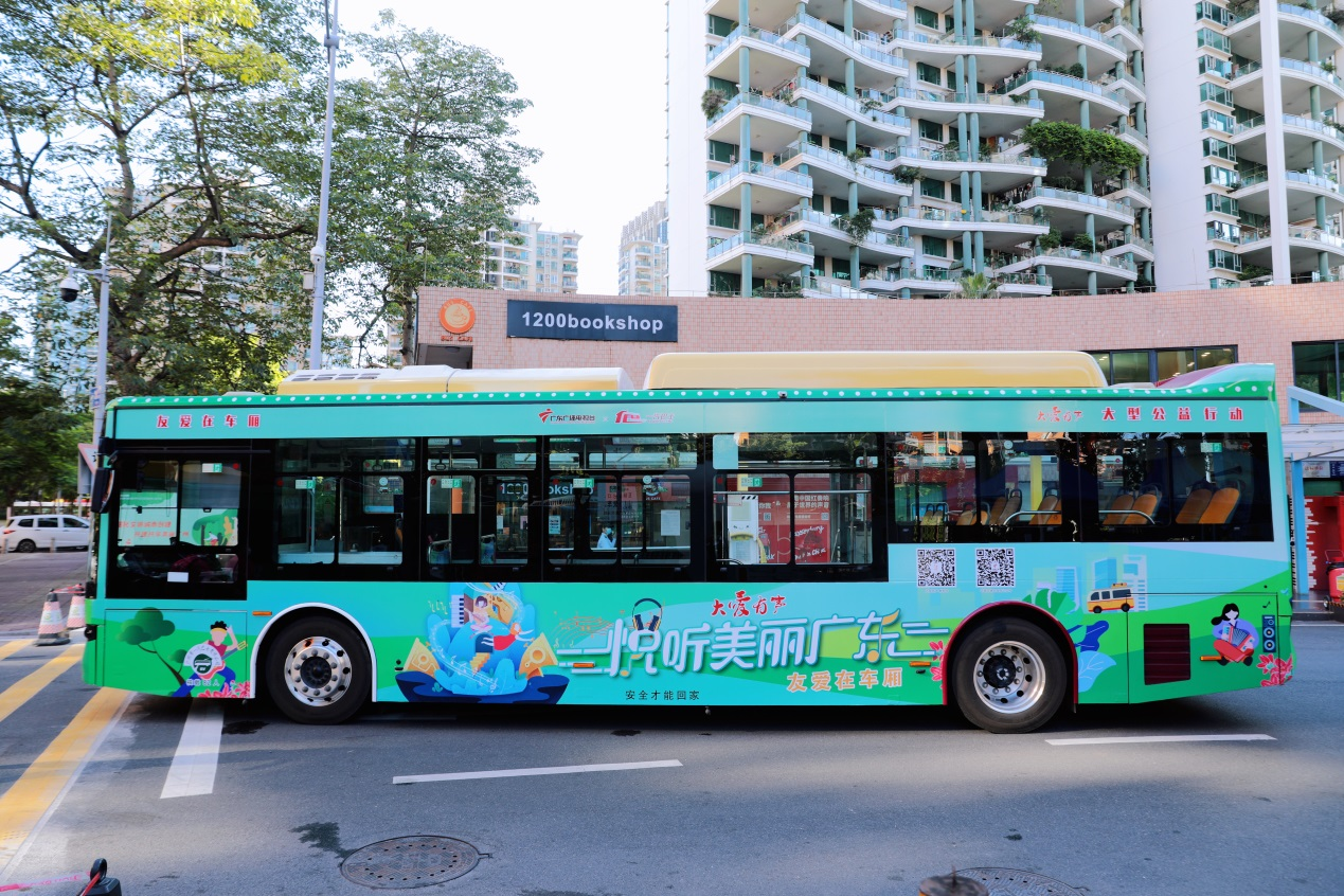 在啟動(dòng)儀式現場(chǎng),由廣東廣播電視臺“大愛(ài)有聲”、一汽巴士“友愛(ài)在車(chē)廂”為愛(ài)發(fā)聲,聯(lián)手打造的3輛“大愛(ài)有聲·悅聽(tīng)美麗廣東”主題公交正式揭幕亮相,綠色環(huán)保元素十分吸睛。這3輛主題巴士將服務(wù)于2、133等線(xiàn)路,穿梭在羊城街頭,搖身一變成為“移動(dòng)融媒直播室”,讓生態(tài)環(huán)境建設的生動(dòng)故事以好聽(tīng)、好看、好玩的方式走進(jìn)尋常百姓家;同時(shí),以公交載體,多維度展現“美麗廣東”建設成果,坐上主題公交,一起打卡“美麗廣東”。