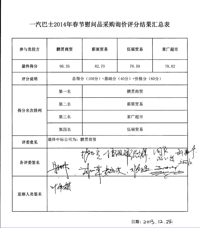 一汽巴士2014年春節慰問(wèn)品采購詢(xún)價(jià)評分結果匯總表