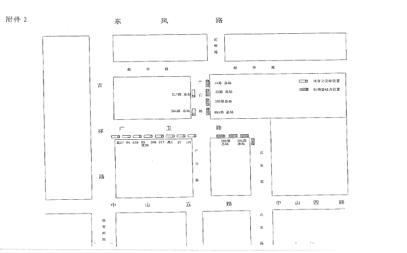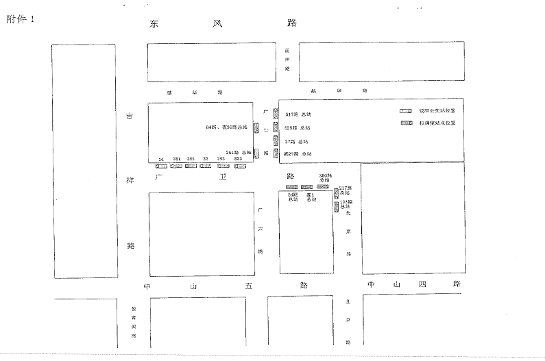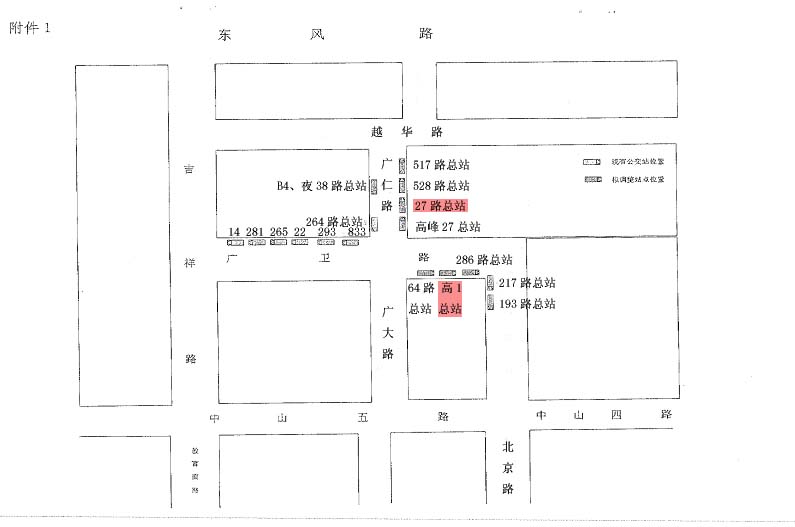 一、第一階段施工期間將原??繌V衛路南側公交總站的我公司27路、高峰1路總站臨時(shí)廣仁路和廣衛路東端(臨時(shí)總站安排詳見(jiàn)附件1)。第一階段施工結束后,各線(xiàn)遷回原總站。第二階段施工期間,原??繌V衛路北側公交總站的我公司14路、22路總站臨時(shí)遷移至廣仁路(臨時(shí)總站安排詳見(jiàn)附件2)。施工完成后,各線(xiàn)遷回原總站。施工期間各線(xiàn)繞行情況詳見(jiàn)附件3。