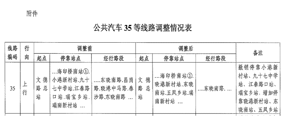接客管處通知,因昌崗路-東曉路口交通整治工程,昌崗路曉港中馬路路口禁止東往南、南往西左轉。為配合上述交通組織調整,從2010年8月21日首班車(chē)起實(shí)施,我公司35路線(xiàn)北行方向恢復經(jīng)行曉港中馬路,恢復??抗财?chē)小港新村站(北行)和九十七中學(xué)站(北行);南行方向由經(jīng)行曉港中馬路改為東曉南路,取消??抗财?chē)小港新村站(南行)和九十七中學(xué)站(南行)等站點(diǎn),增加??抗财?chē)曉港新村站(南行)和東曉南路站(南行)等站點(diǎn),具體調整情況見(jiàn)附件。請候車(chē)乘客注意線(xiàn)路的變更。