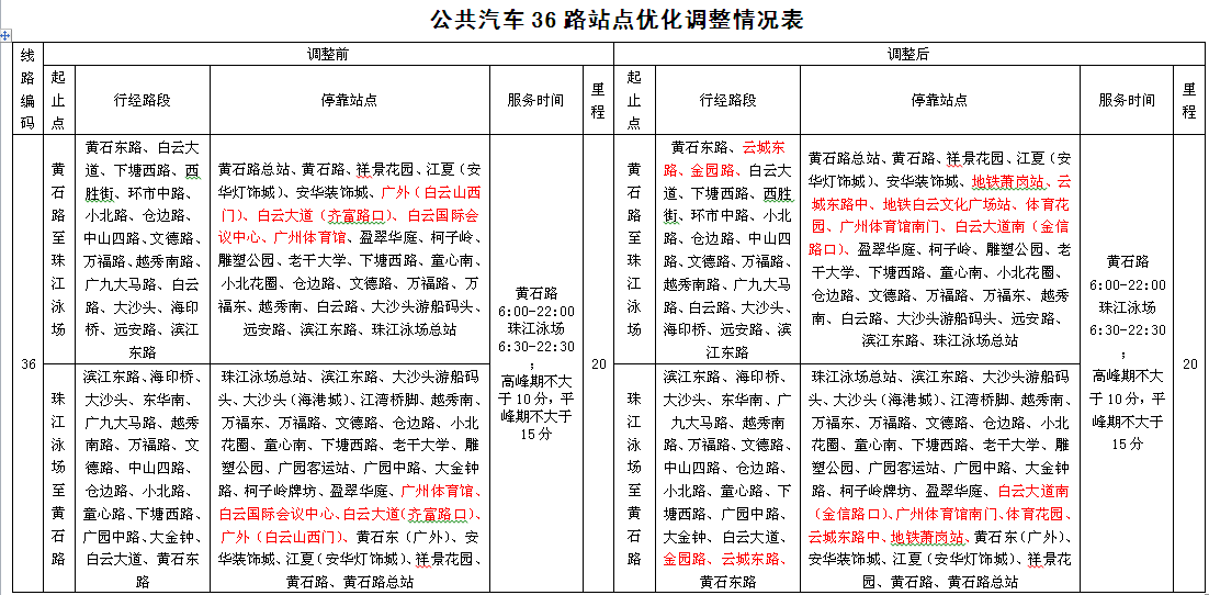 一、調整公共汽車(chē)36路增加行經(jīng)云城東路、金園路,接駁地鐵二號線(xiàn)蕭崗、白云公園等站點(diǎn),調整后線(xiàn)路具體行經(jīng)路段、??空军c(diǎn)等詳見(jiàn)附件。